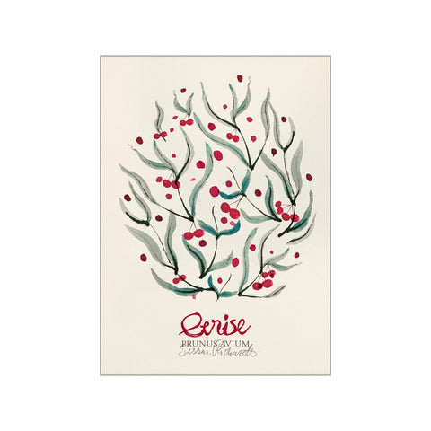 Watercolor painting of a cherry branch in shades of teal and grey, while the cherries are a deep red, handwritten French text |