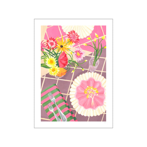 Presenting a colourful modern still life painting in a birds eye view composition displaying a pretty pink flower picnic scene. |